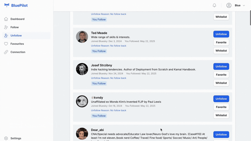 Smart Unfollows is a new feature on BluePilot that gives you immediate unfollow recommendations. Here’s a list of what it does: