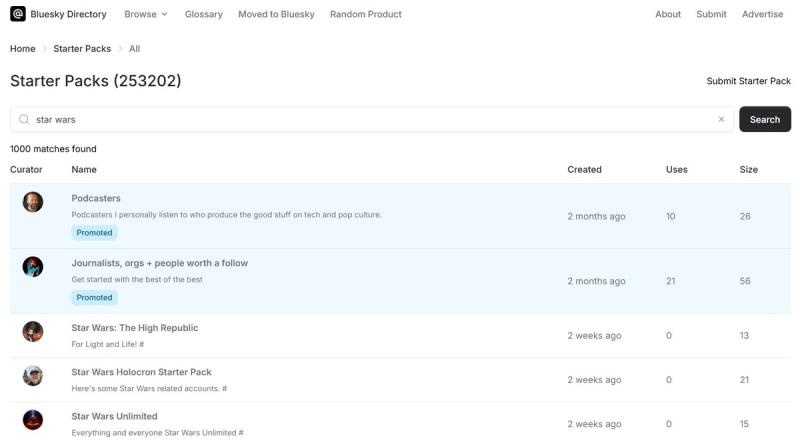 Bluesky starter packs are not eligible to appear in search results, but there are user-created tools that help solve this. Bluesky Directory is an online search tool that allows you to find certain starter packs based on keywords. Tap on the search bar and search up general keywords like “anime”, “marvel”, and “birds”, or even more specific keywords like “game of thrones”, “new york giants”, and “star wars”. A long list of user-created starter packs containing those keywords will appear, allowing you to find starter packs that cover specific interests.