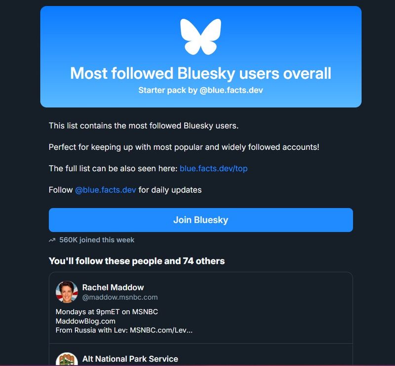 Starter packs are user-made compilations of profiles that create content for a particular topic. Users can create, share, and instantly follow anyone in a starter pack. There’s endless possibilities for what starter packs you can find, but they’re a great way to build your feed to align closely with your interests. Below is a popular starter pack that includes the most followed users on Bluesky.