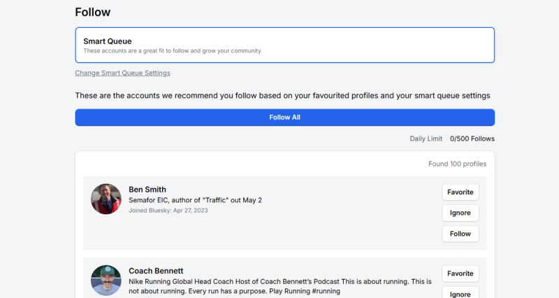 Smart Queue is a feature which automatically suggests real and relevant accounts to follow, tailored to your needs and interests. To start, we ask you to add a few examples of your favourite Bluesky accounts. Our system then references these profiles to find other profiles with similar content, which come up as follower suggestions. Additionally, customized search options enable you to automatically eliminate accounts that are labelled as spam or NSFW from your suggestions. You can follow these accounts straight from your suggestions list with no need to enter the Bluesky app at all. It’s that easy.