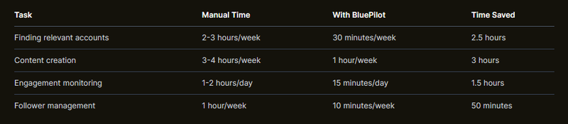 Time investment compared to traditional marketing efforts should show efficiency gains, especially when using automation tools like BluePilot.