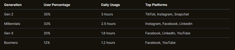 Generation Z leads social media adoption with 35% of total users and 3 hours of daily usage. These digital natives have grown up with social media and expect seamless, personalized experiences across platforms.